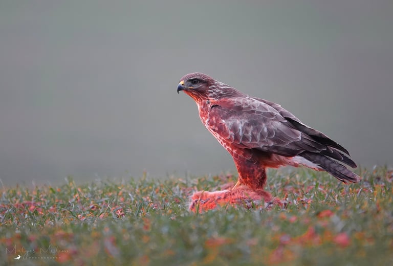 Přišel další den, kdy předpověd hlásila slunečno a tak jsem zkrátka neodolal. Dokoupil jedny poslední kuřecí krky, které se ukázaly jako pro káně velice chutné, a vyrazil na poslední pokus o vyfocení těchto krásných dravců. Na místo jsem přijel až k poledni a z dálky dalekohledem pozoruji, že jedna káně dojídá včerejší zbytky. Zároveň vidím, že se dostavil nováček, tedy krásná hnědá forma, kterou jsem ještě na fotce neměl. Velice nerad jsem ji vyplašil a po přidělání dalších krků jsem rychle zalezl do stanu. Po hodině konečně slyším výkřiky, které jsou stále blíž a blíž. Na malou chvíli všechno ztichlo a najednou silný výkřik a káně už je na místě. Bohužel se nejednalo o tmavou formu. Půl hodiny poseděl (zase nuda) a letěl dál.