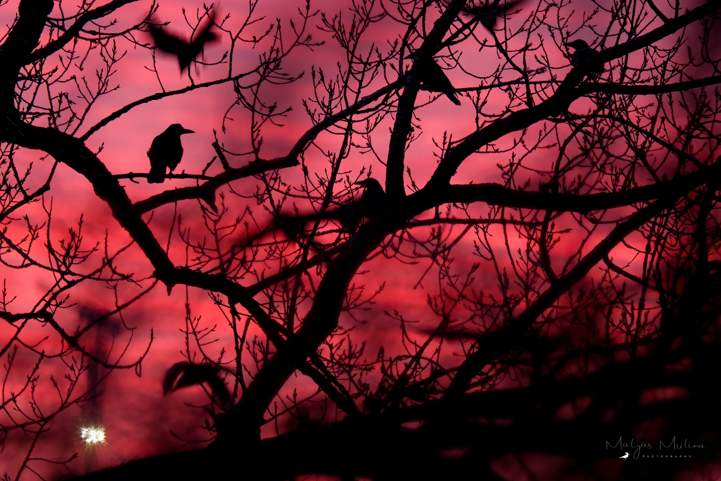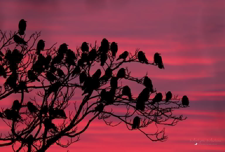 I was already getting ready to go home, but in the distance, I heard the piercing calls of jackdaws. There was still some time before sunset, so I decided to give it one more shot. After a while, I found them at Žlutý kopec, where I experienced something truly magical. The clouds in the sky changed colors by the minute — from deep red, through pink, all the way to violet. That evening, I captured a photo that would later bring me great success.