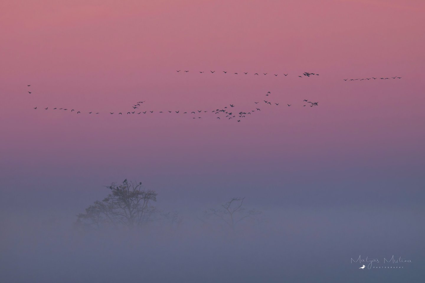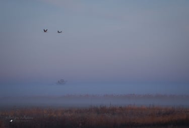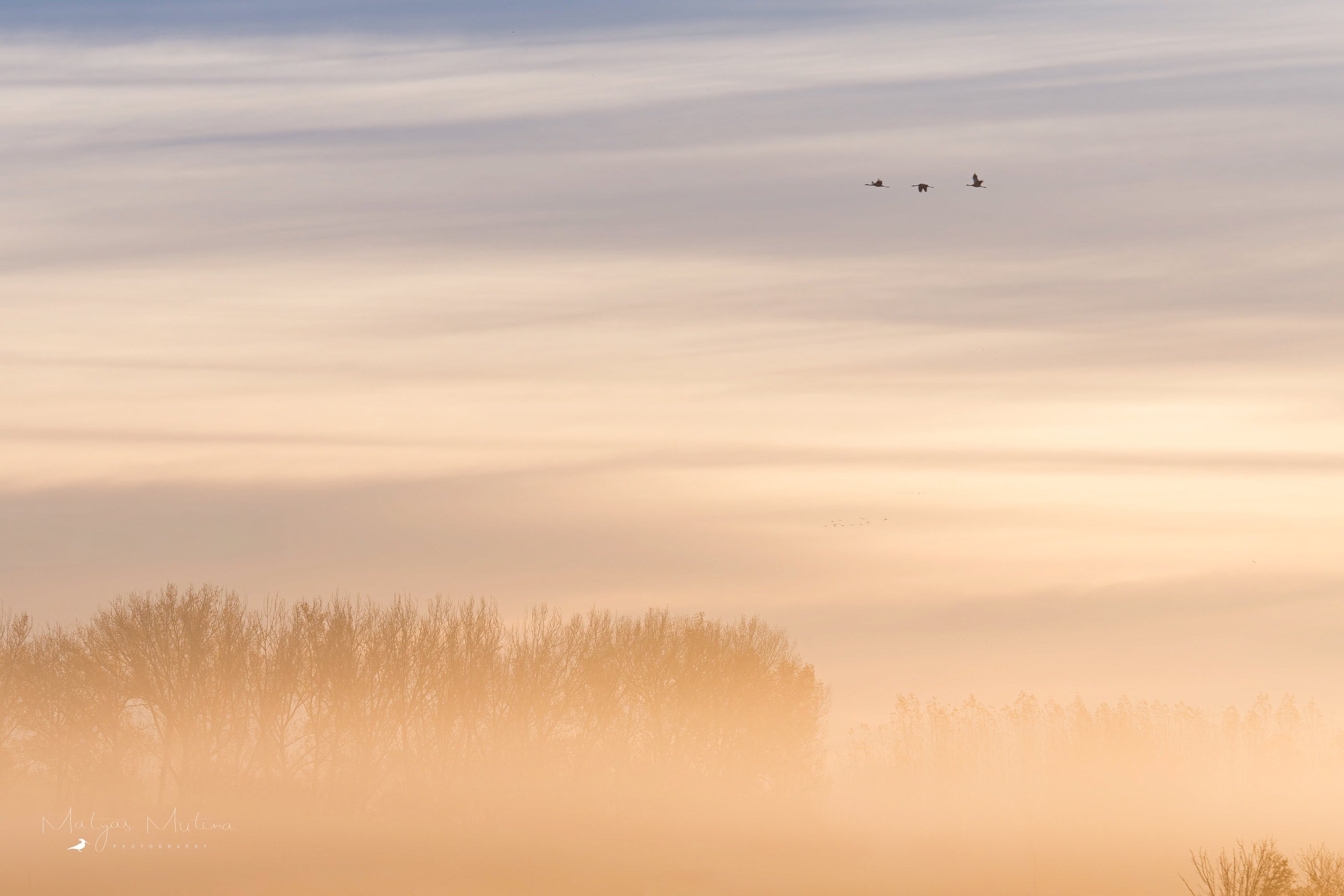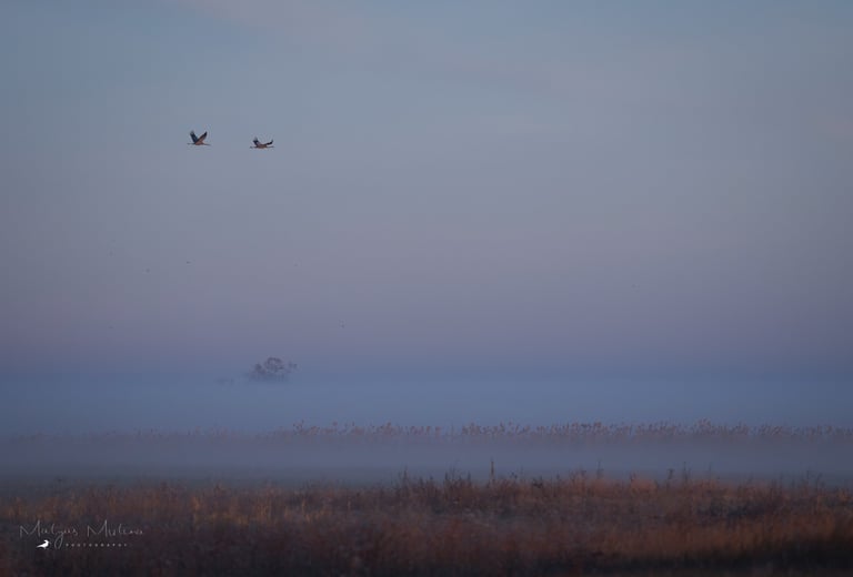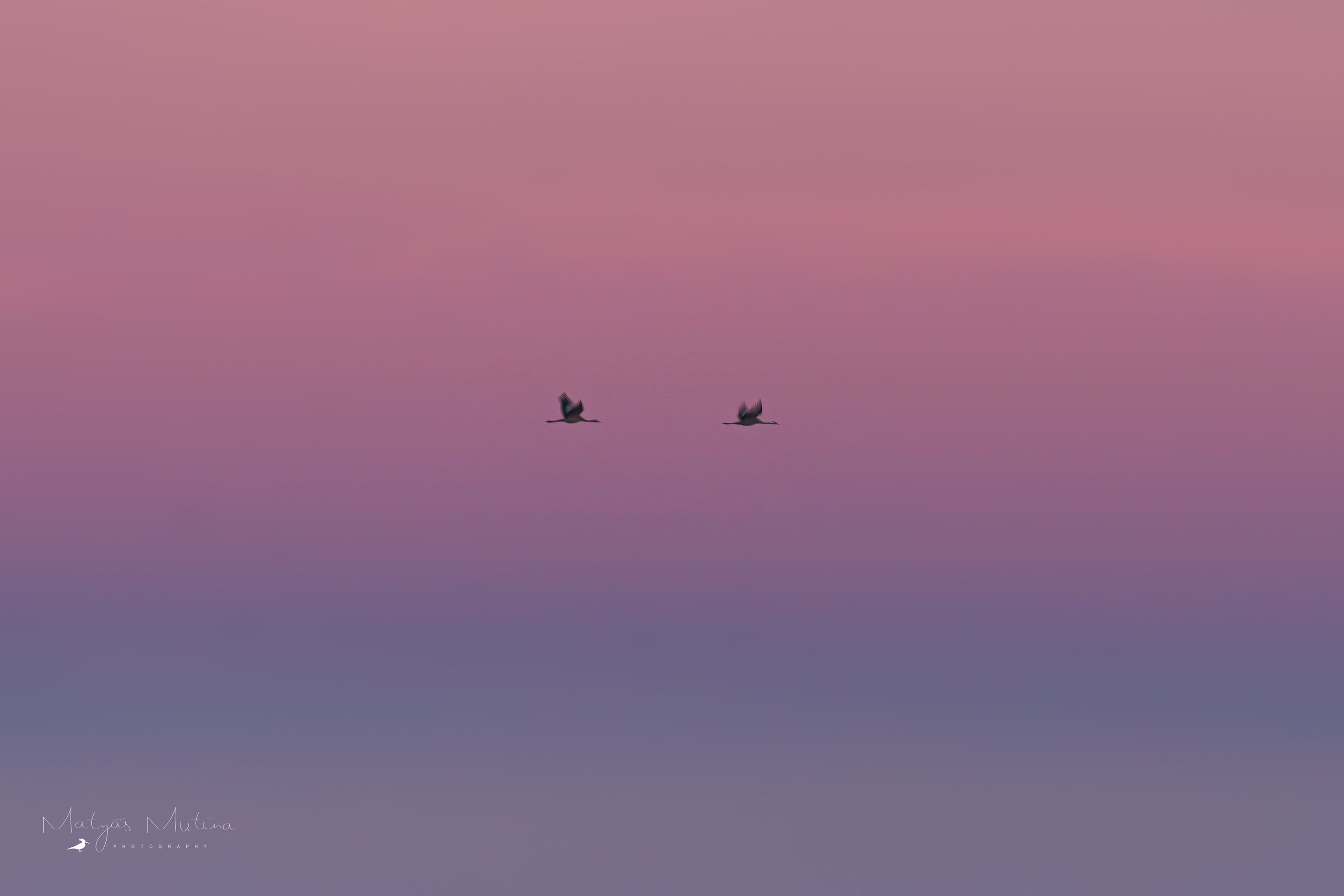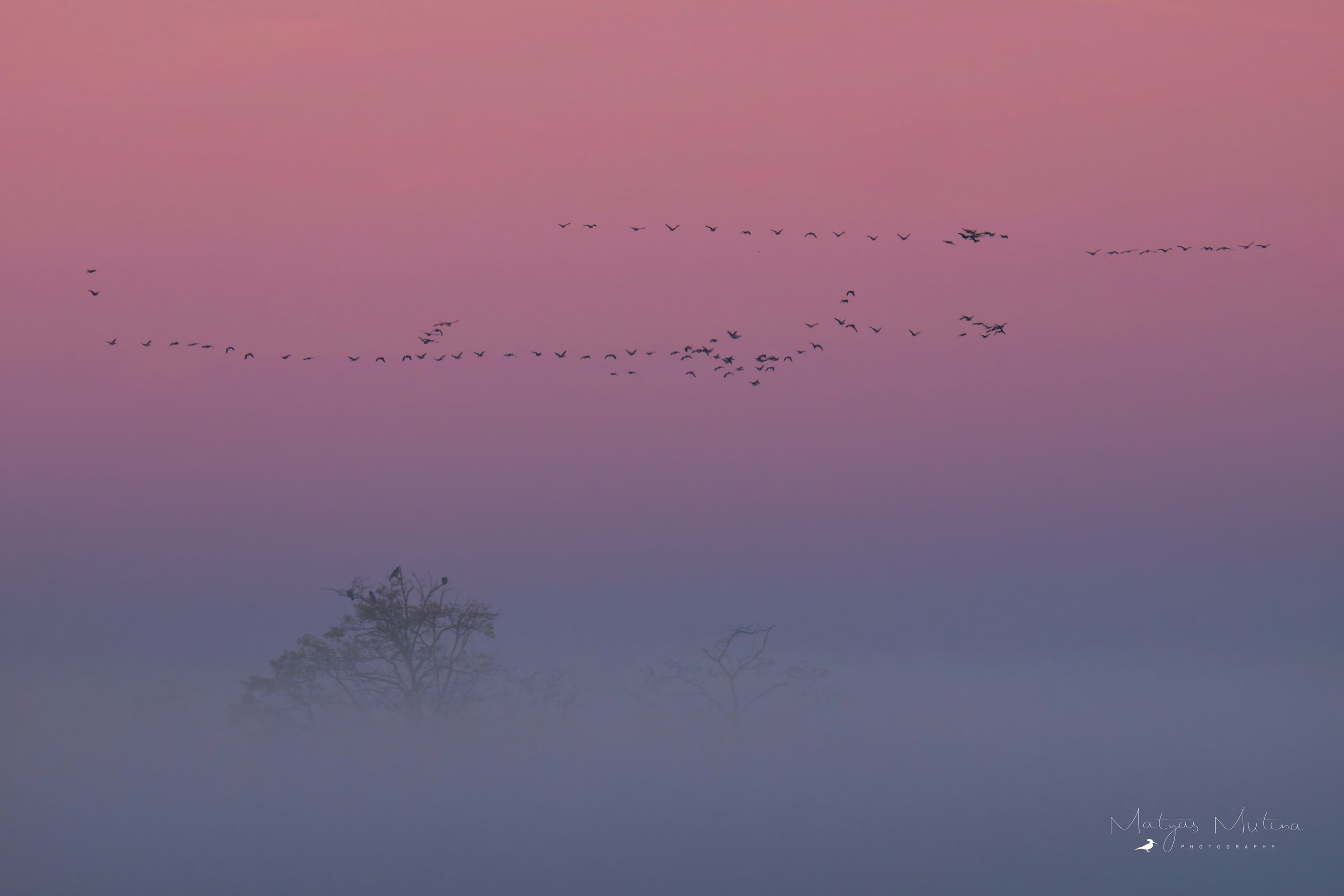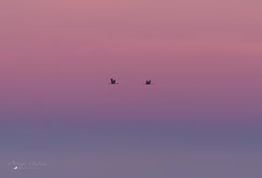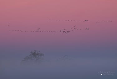Ranní rozlet jeřábů se nakonec podařil na jedničku. Kromě mlhy se začala krásně zbarvovat obloha. Na východu se zbarvila do červenooranžova, kde po chvíli vylezl i červený kotouč, a na zapádu zase do růžovofialova. Člověk si tak mohl jednoduše vybrat, jaká barvička se mu na fotce líbí nejvíce, protože jeřábi létali úplně všude!